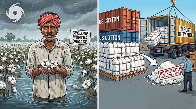 Cotton farmers in Andhra Pradesh can’t seem to catch a break. First, Cyclone Montha left their fields waterlogged and their cotton soaked. Now, as they try to sell what’s left of their crop, they’re running into a wall: the Cotton Corporation of India (CCI) doesn’t want to buy, and the market is flooded with cheap American cotton.